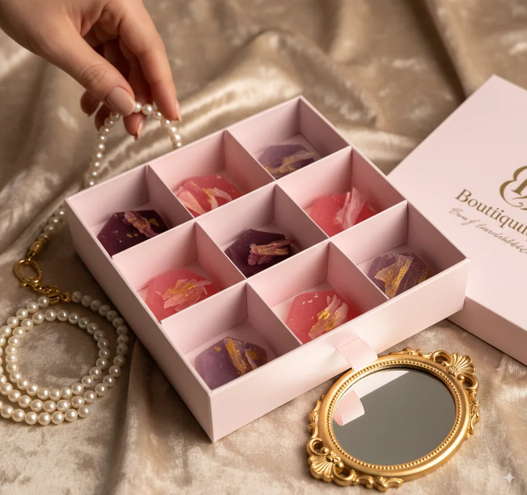 Una caja elegante que reúne cristales de cinque con sabores afrutados y florales para una degustación preciosa.